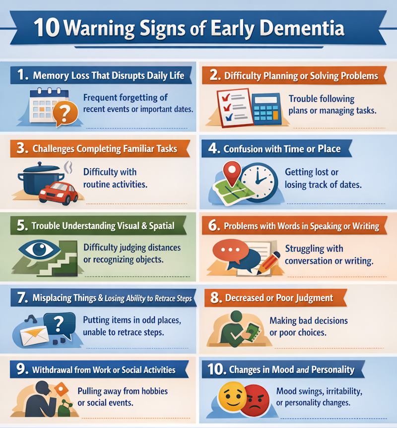 Recognizing the early signs of Alzheimer’s can make a real difference in quality of life. Memory loss, difficulty completing familiar tasks, confusion, mood changes, and withdrawal from activities are all signals to seek professional evaluation.